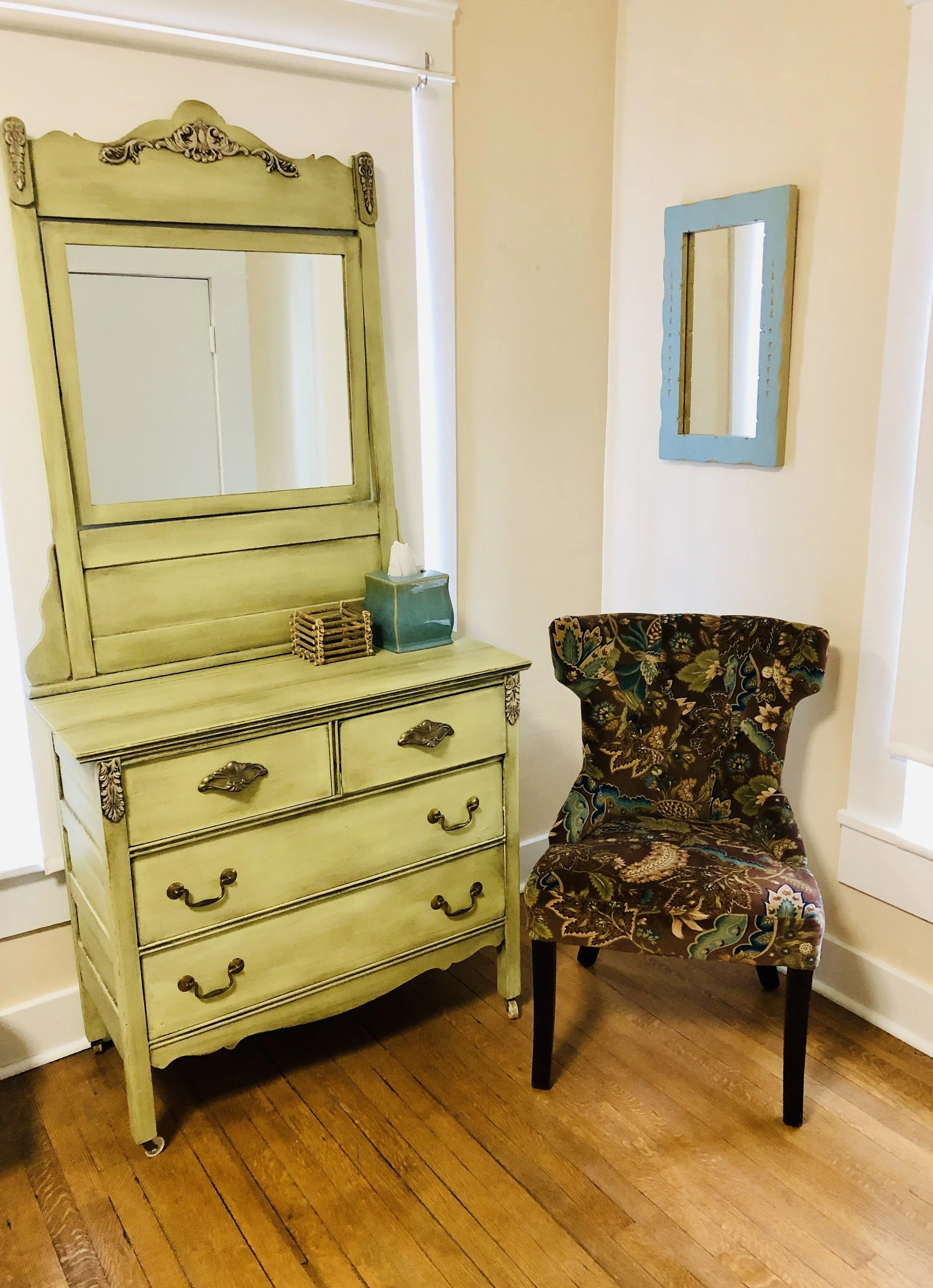 One of the largest rooms in the inn, the O’Keeffe has a beautiful four-poster bed draped in elegant bedding of soft gold color. A corner table and comfortable chairs offer a perfect place for reading and relaxing.